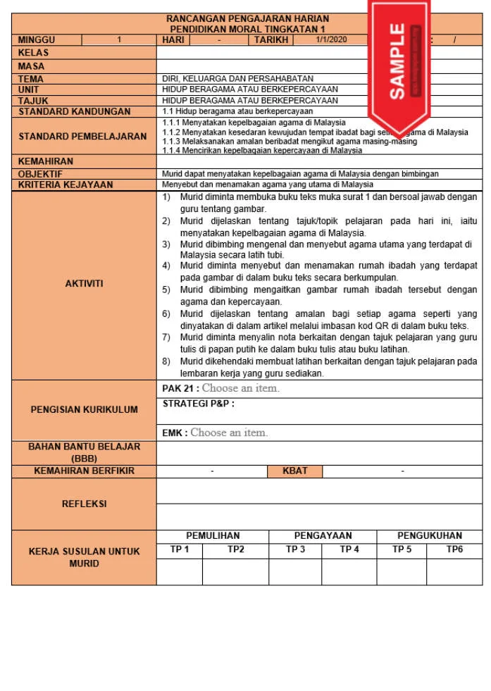 RPH DAN RPT – PROGRAM PENDIDIKAN KHAS INTEGRASI PENDIDIKAN MORAL TINGKATAN 1